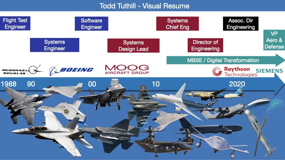 This is my career in an image. I have been a part of or led the design teams that developed all of these aircraft, and many more. Most of my experience is in developing flight control systems. I love this aspect of aerospace design because it touches so many aspects of aircraft development from aerodynamics to airframes to performance and stability. It involves systems, mechanical, electrical, electronics, and software engineering development and test. You can find more details of my experience here: Todd Tuthill on LinkedIn